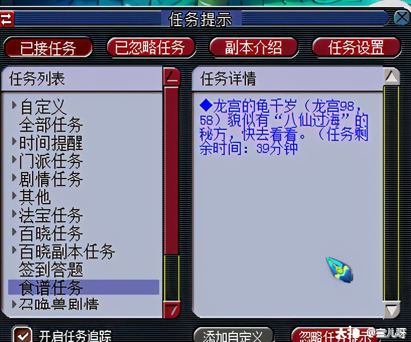 比较麻烦的是,所有的美食后续任务都是无法在任务追踪栏的,必须点选alt+Q打开任务才可找到任务提示。