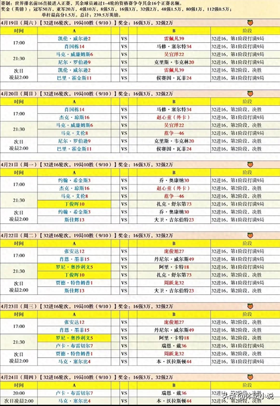 北京时间4月19日,斯诺克世锦赛正赛将在今日开打,目前世锦赛最新的赛程已经出炉,中国军团10人亮相克鲁斯堡冲击16强,其中肖国栋和雷佩凡将亮相揭幕战,分别迎战马修-塞尔特和卫冕冠军凯伦-威尔逊,比赛时间会在17点开打,其他球员比赛时间看下图!