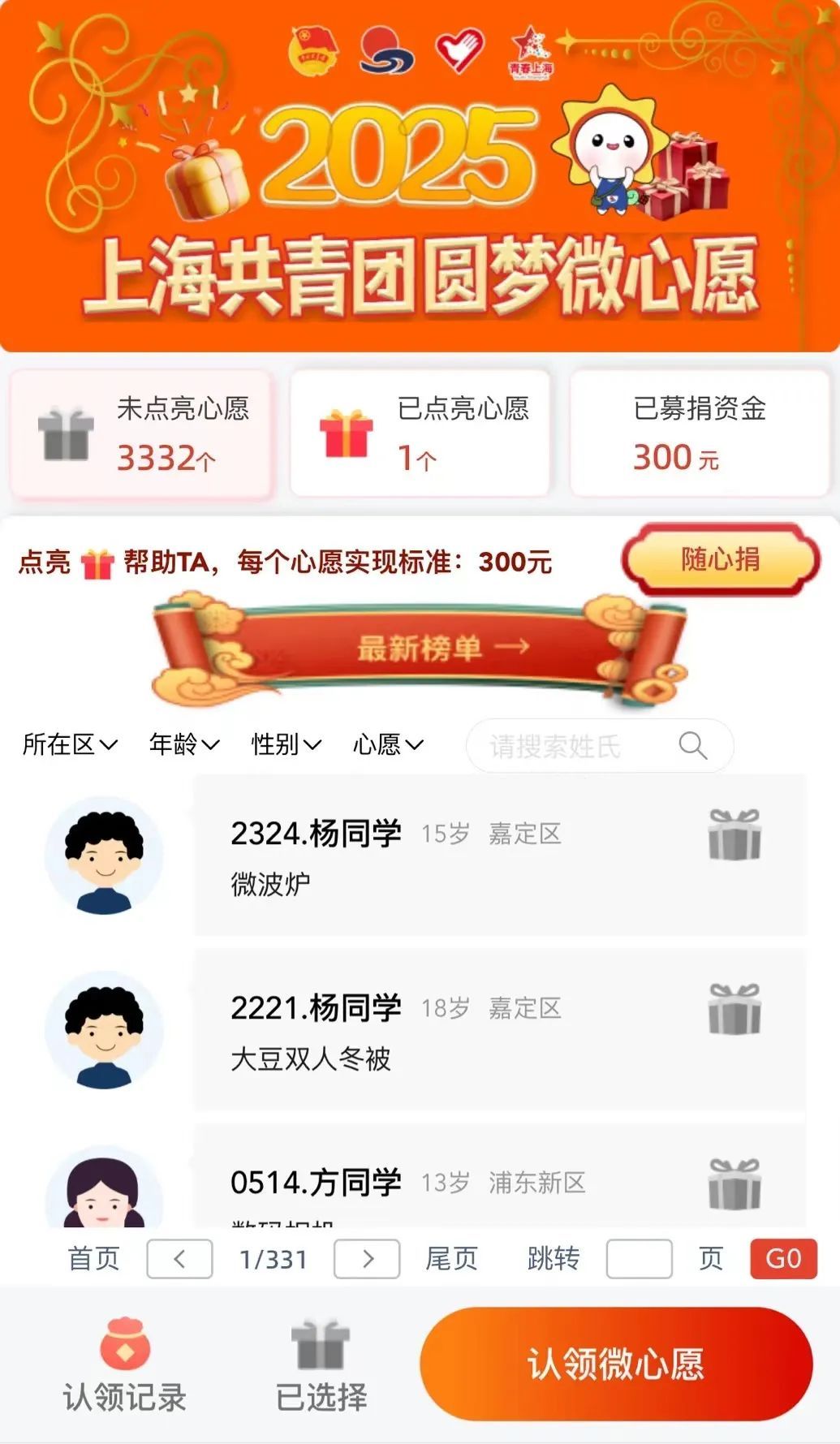 点击“所在区” 、“年龄”、“性别”、“心愿”或输入姓氏,即可查询对应心愿;