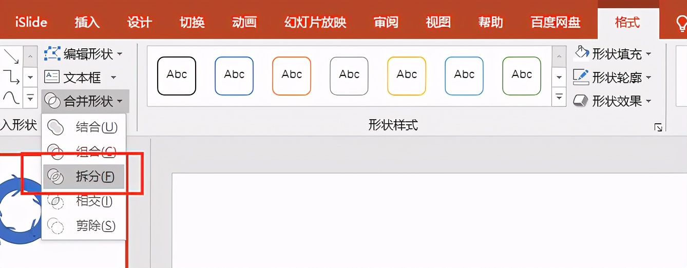 然后点击【格式】-【合并形状】-【拆分】