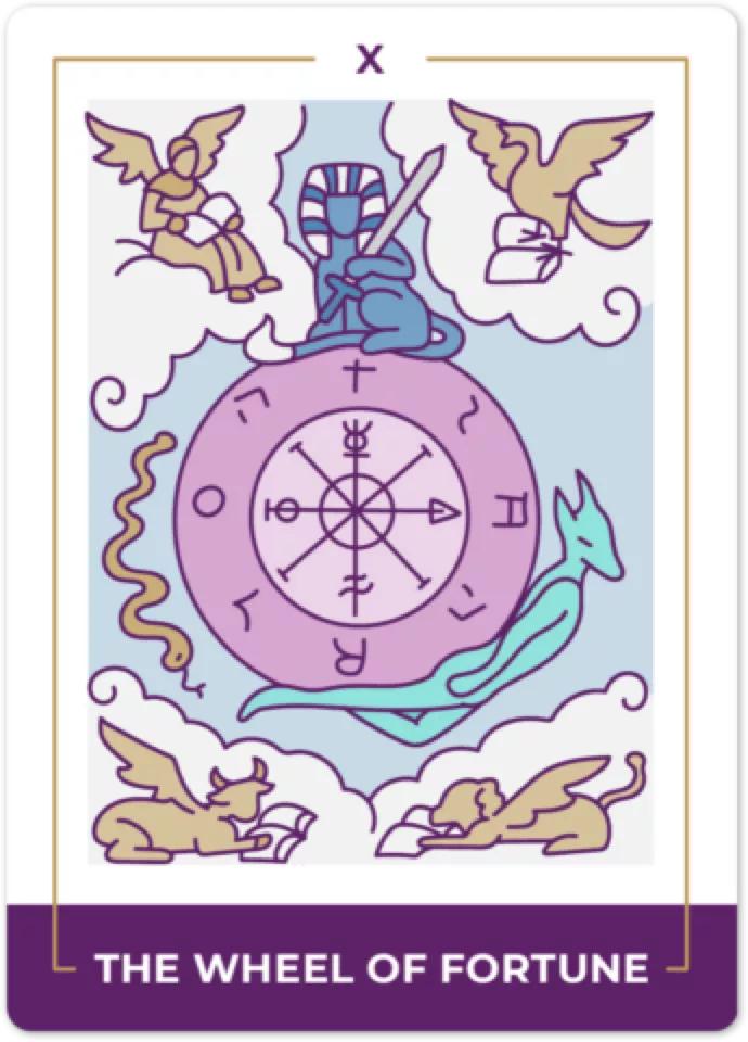 10. 命运之轮(The Wheel of Fortune):命运之轮描绘了一张旋转的车轮,它代表着命运和命运的转变。这张牌提醒我们生命中的高潮和低谷都是暂时的,我们需要适应变化并享受每一个阶段。