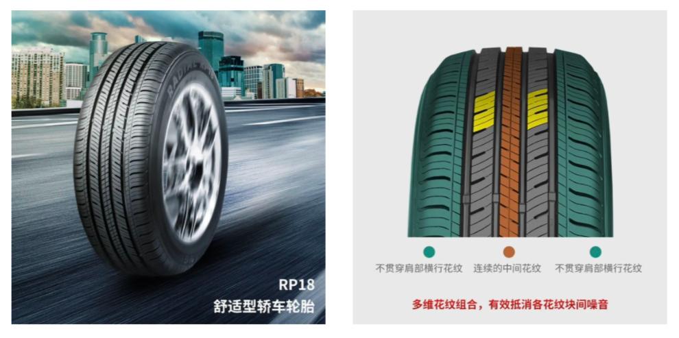 RP18是朝阳产品线中把静音和舒适性处理得比较好的一款,胎面采用三种花纹不对称组合,有效抵消了各花纹块间的噪音,中间三组斜向横纹优化了接地时的应力分布,避免了较大的胎噪产生,同时也能更好地适应复杂路况的架势.