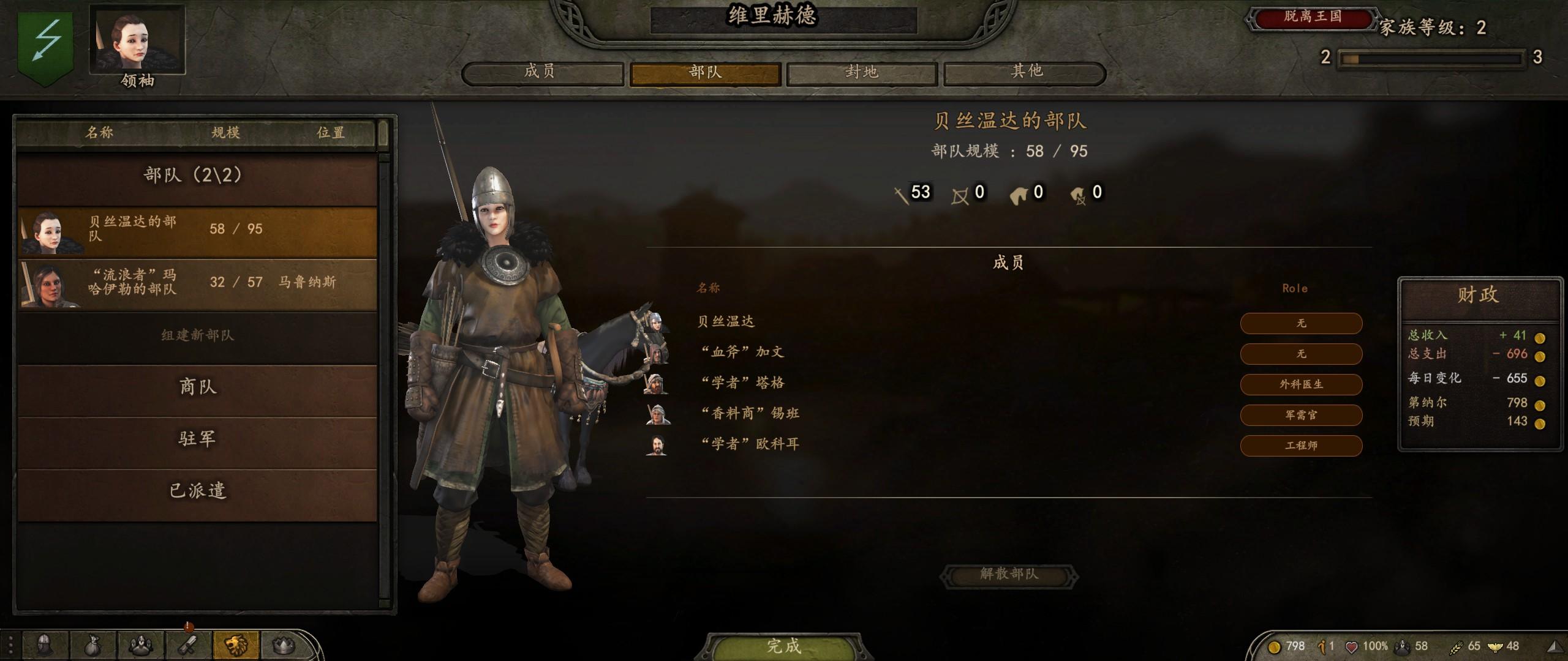 上面说到团队同伴各司其职,但就目前而言,同伴不像一代中择优使用,也就是能力等级高的自动替代能力等级低的,二代中家族中有斥候,军需官,军医和工程师,其中斥候可以增加玩家在地图上的可视范围(一代中使用全地图驱除战争迷雾的举个手,笑),侦察技能与这个职务挂勾。军需官可以增加军队容量,并在购买必需品时获得一定优惠,交易和这个职务有关。军医和工程师比较明显,前者需要治疗,可以增加玩家部队伤员恢复速度,工程师和工程有关,增加攻城或守城时攻城工具建造速度。