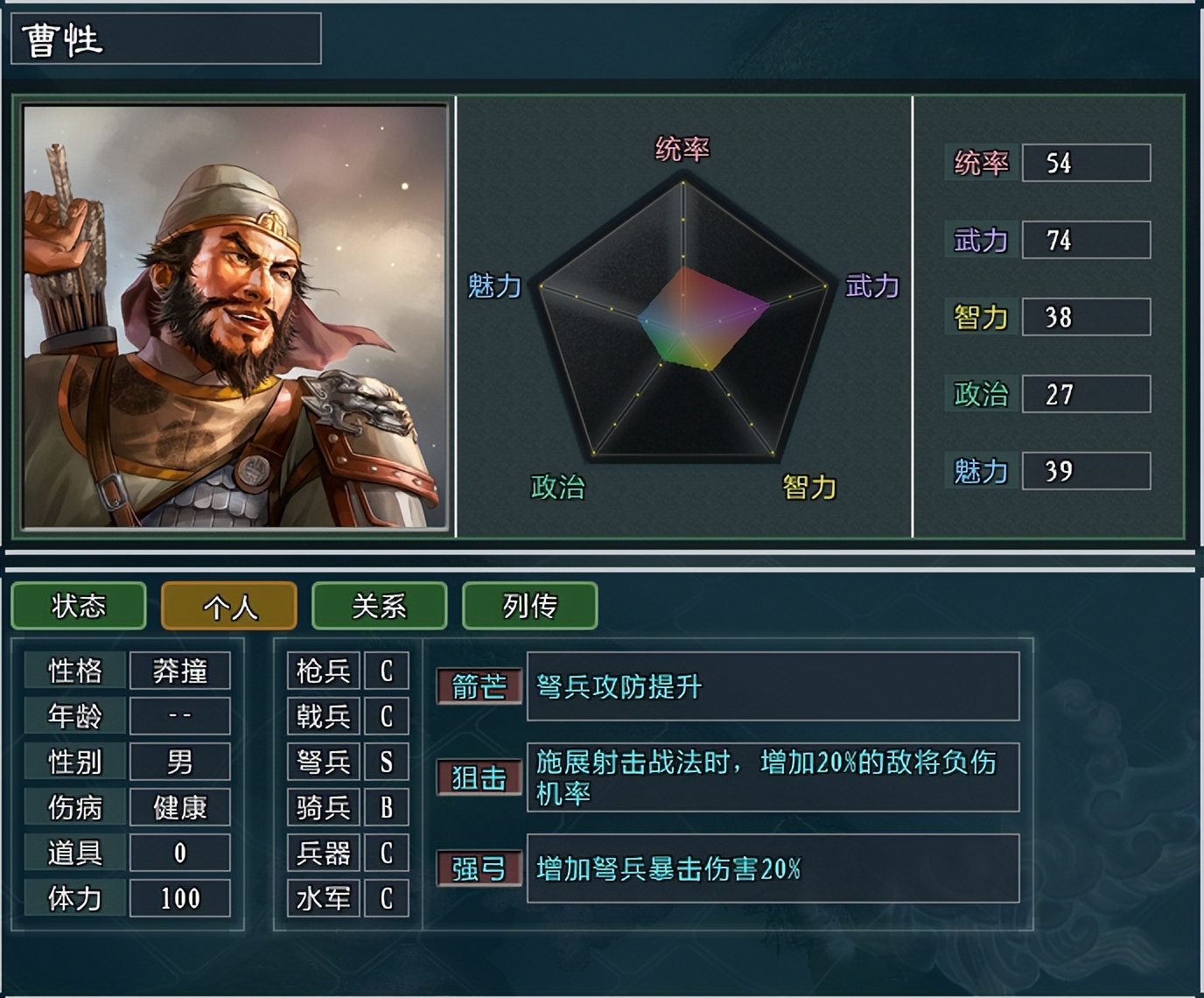 最高的武力属性也才74,其他属性更是辣眼睛。就曹性这属性,在大浪淘沙里基本上就是个废人,即便是在属性较低的原版中,也是个极边缘的角色。