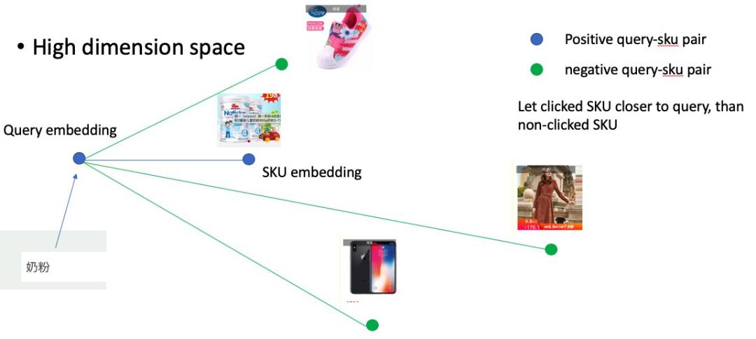 通俗的讲就是训练一个模型,该模型通过将 query 和 sku 映射到统一维度空间,在该空间中,相似的商品距离近,不相近的商品距离较远。如上图例子,query=奶粉,在高纬空间里,相对鞋子、服装、手机,奶粉商品距离 query 更近。这是建模过程,生成 query 和 sku 的向量数据。