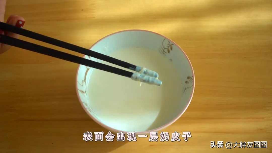完全凉透之后呢,表面会出现一层奶皮子,用筷子挑起来吃了就行。
