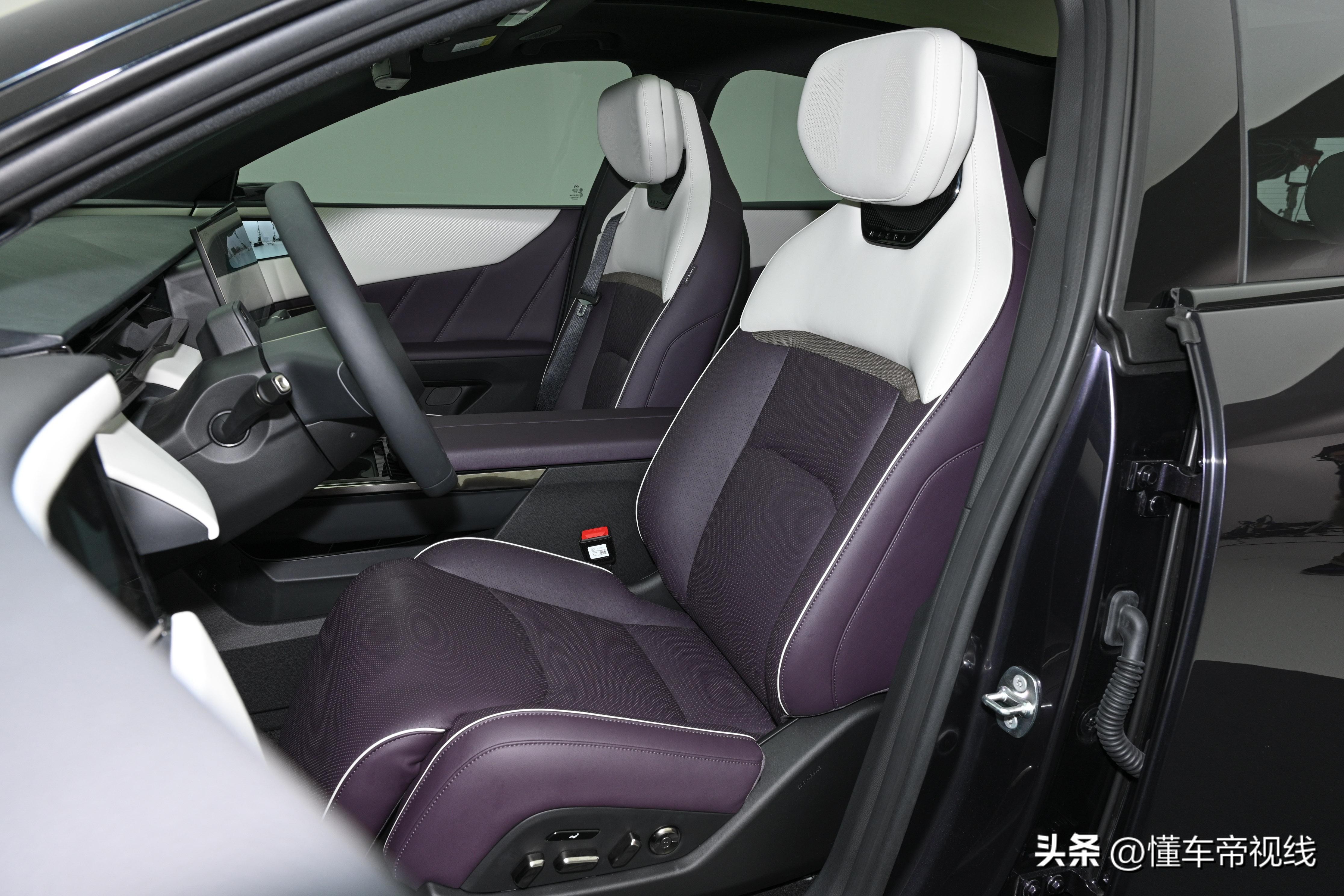新车在副仪表台下侧采用镂空设计,可进一步增加储物空间。此外,实拍车型前排配备有双零重力座椅,采用白色和紫色双拼配色组合,标配通风/加热/按摩以及头枕音响配置。据悉,主驾座椅具备16向电动调节,副驾座椅具备14向电动调节,支持电动腰托和电动腿托功能。