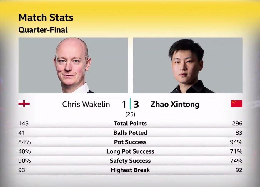 世锦赛8进4最新战报:赵心童3:1领先韦克林,希金斯3:1威廉姆斯