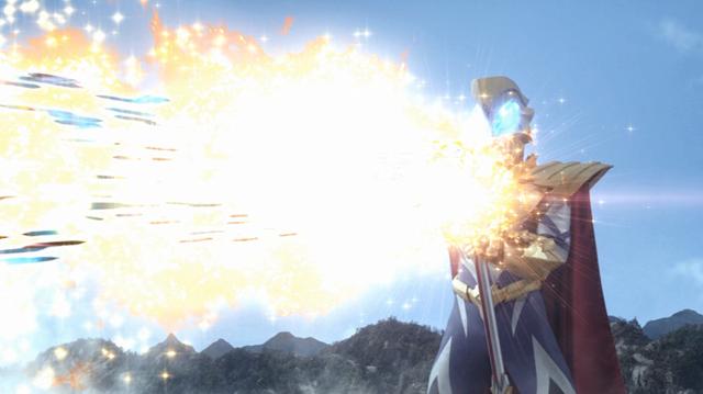捷德借用泰罗奥特曼的力量,将泰罗胶囊插入王者圣剑,融合泰罗的招牌技能斯特利姆光线,有蓄力的动作,周身吸收五颜六色的能量,然后释放出五彩斑斓的光线“斯特利姆闪光”,尊皇捷德使用此招,消灭了雷霆杀手。