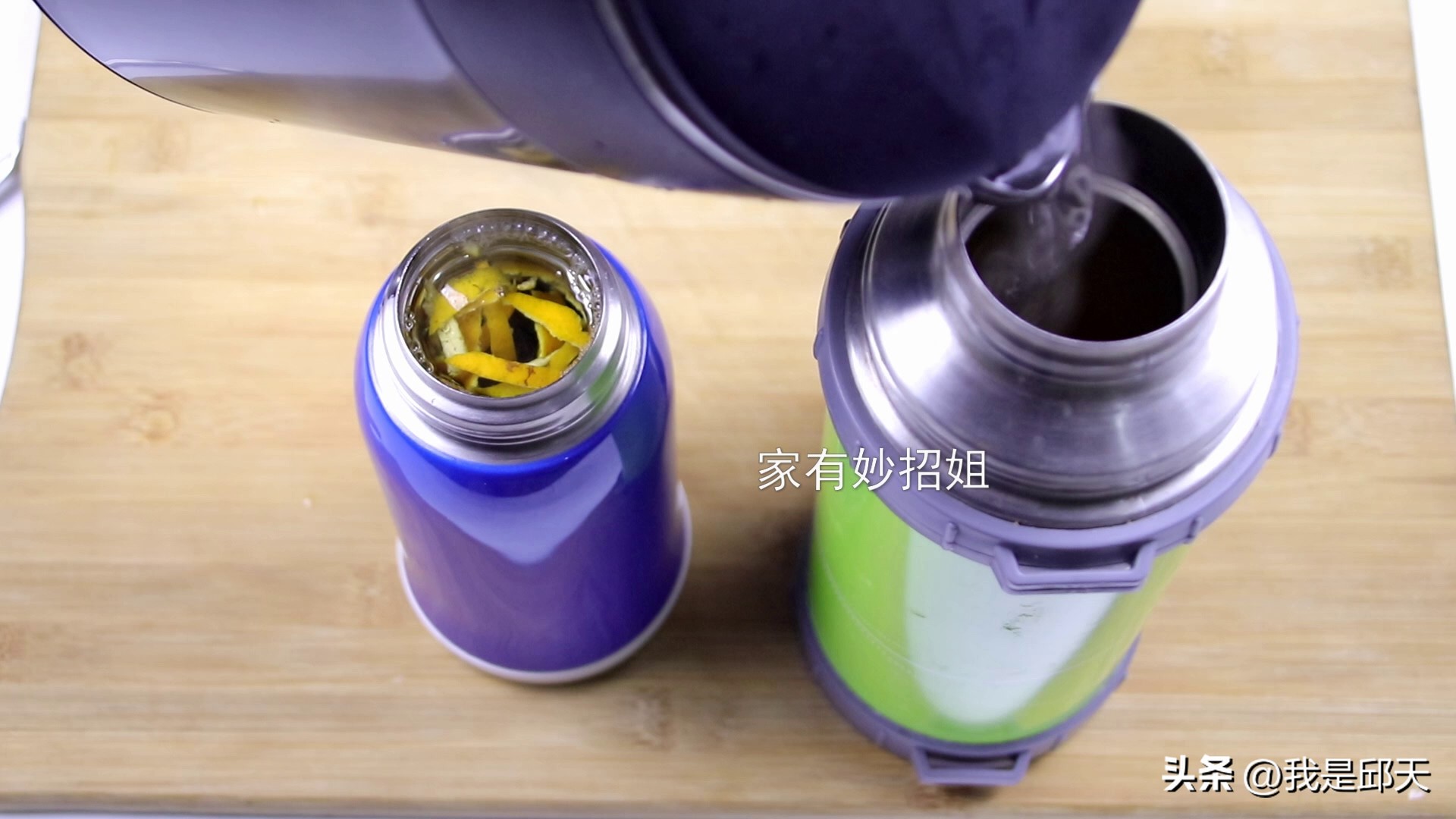 静置的时间差不多了,我们将里面的橘皮以及水都倒出来,这样关于保温杯内有异味的问题就解决了,方法简单有效,要是你的保温杯也有同样的困扰,就可以利用上这个方法。如果今天的文章对您有帮助,那就点一个关注,点一个赞,感谢您的支持。