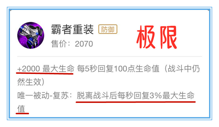霸者重装能够给使用者增加2000点生命值,这个数据在王者荣耀里是最多的,这让它即使没有法强加成也能给瑶的护盾增加200点吸收上限,和冰霜法杖(210)无限接近。