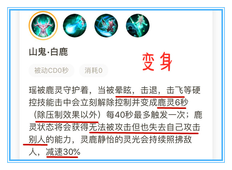 瑶在受到晕眩、击退、击飞这些控制的时候会立刻解除控制,然后变身一只白色的可爱的小鹿。但是这个变身也不是无敌的,它有两个限制条件。