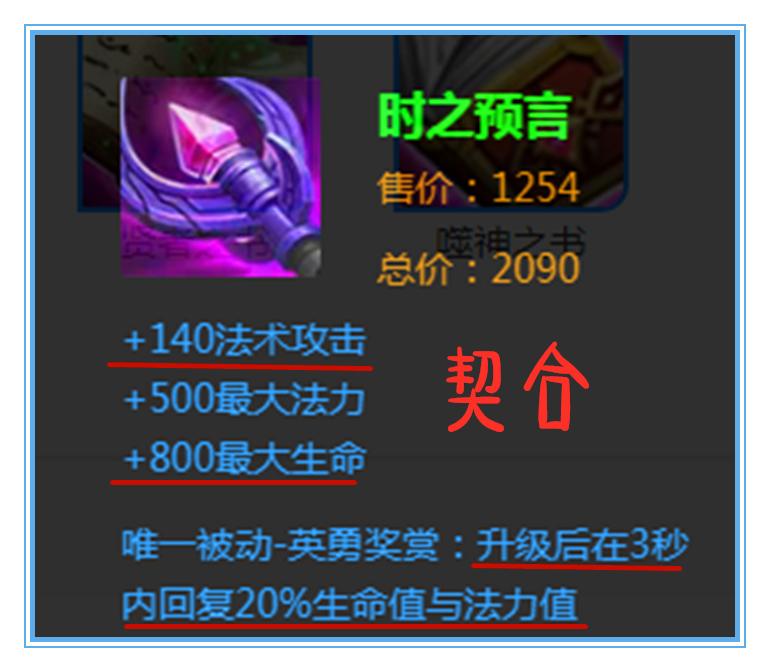 首先我们看一下时之预言的属性(它增加双抗的被动我没截),能增加法术攻击力,能增加最大生命,能增加双抗,再加上好像还可以在升级后恢复生命值和法力值(待测试)。