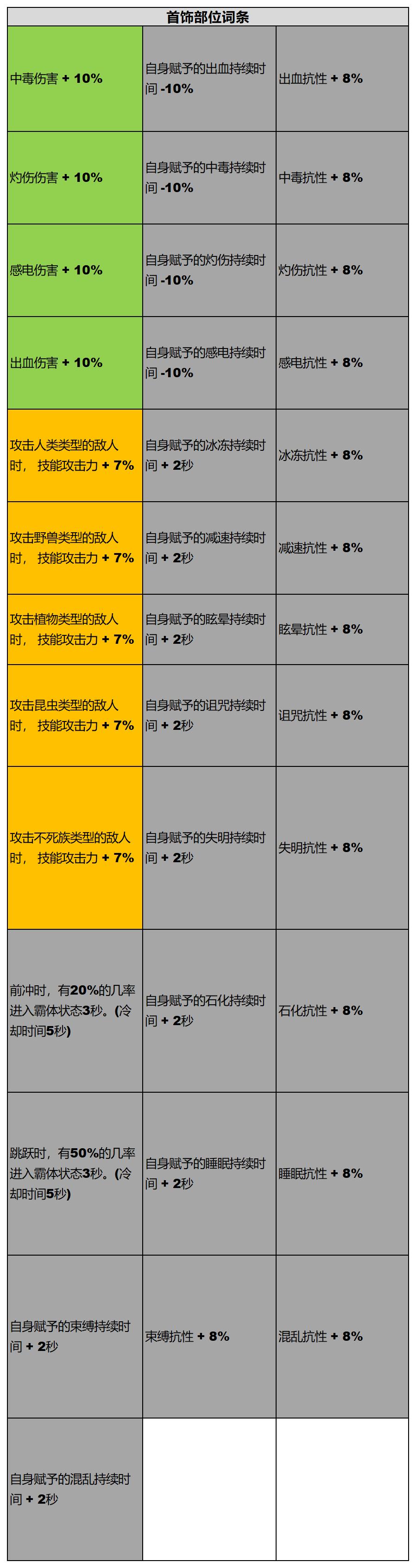 首先,各个系列自定义装备的专属词条如上图所示,已经给大家整理出来了,适用面较大,条件较为轻松的词条为绿色标注,适用面较低,需要满足一定条件触发的词条则为黄色标注部分,而灰色标注部分除部分特殊需求,此类词条作用较小。