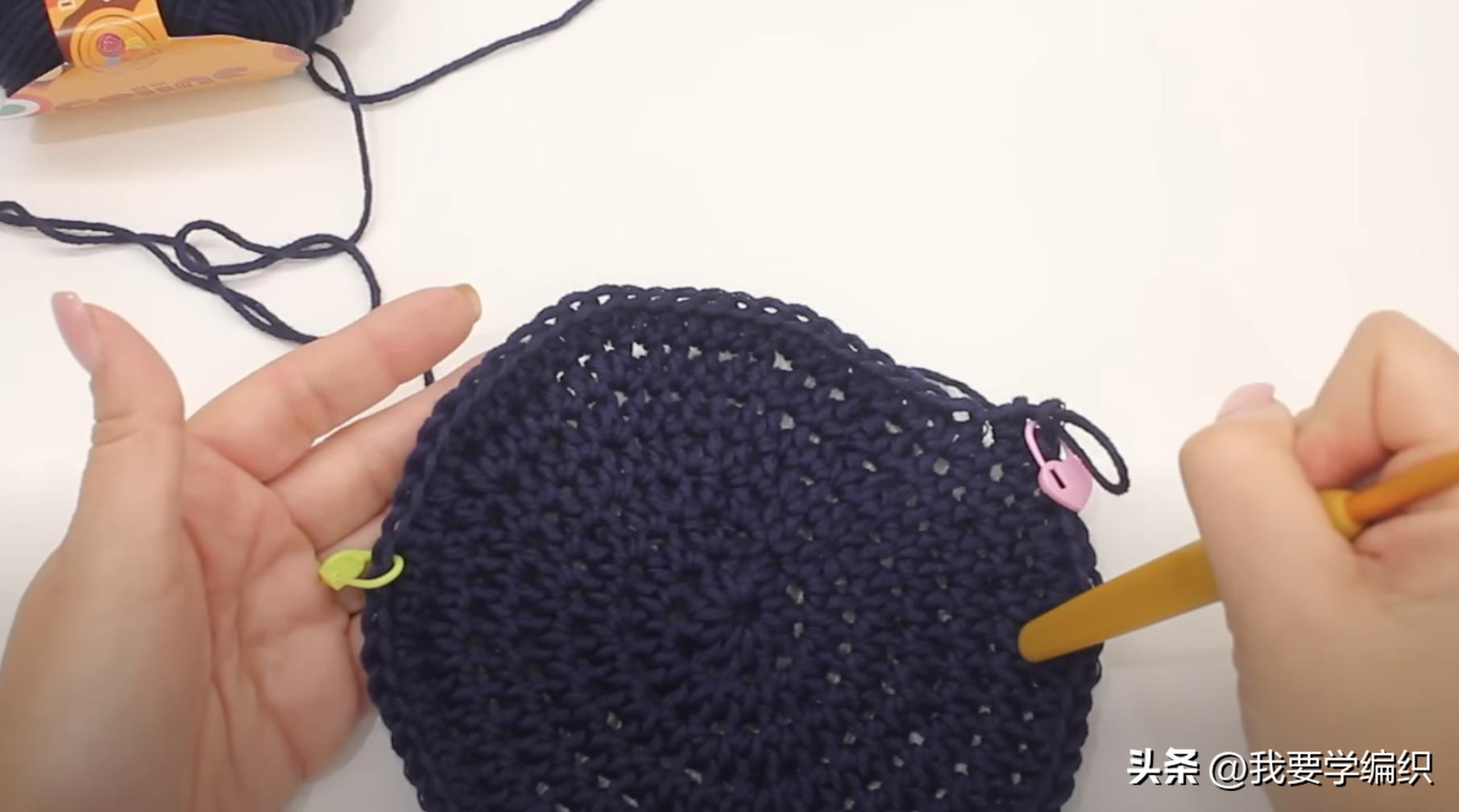 接着我们要用记号扣扣出帽檐部分。我们先用总针数除以3,即70/3≈23针,再用23*2=46针,这46针就是后脑的针数,剩下的24针为帽檐的针数,我们就用记号扣将这两部分区分开来。第8圈:帽檐24针处,隔2针加1针;46针处,不加不减钩中长针;第9-10圈:不加不减钩中长针(注:记号扣要移到相应位置)。