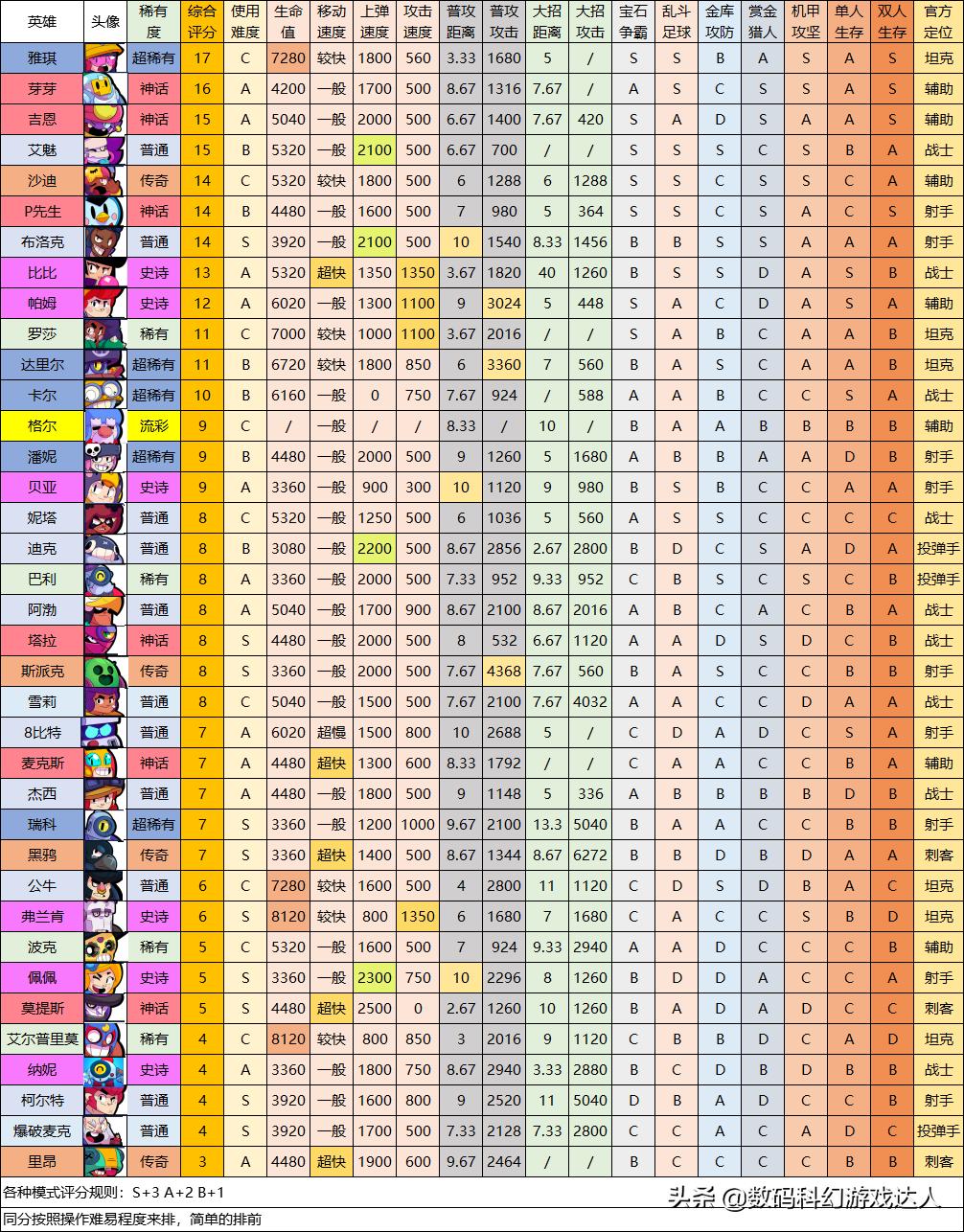 本次对全英雄属性和强度排名进行了更新(以英雄10级满级为参照物),调整了部分英雄的地图评级,加入了每个英雄的生命值,移动速度,上弹速度,攻击速度4个属性,让大家全方位了解英雄的属性,在对战的过程中能有更高阶的把握