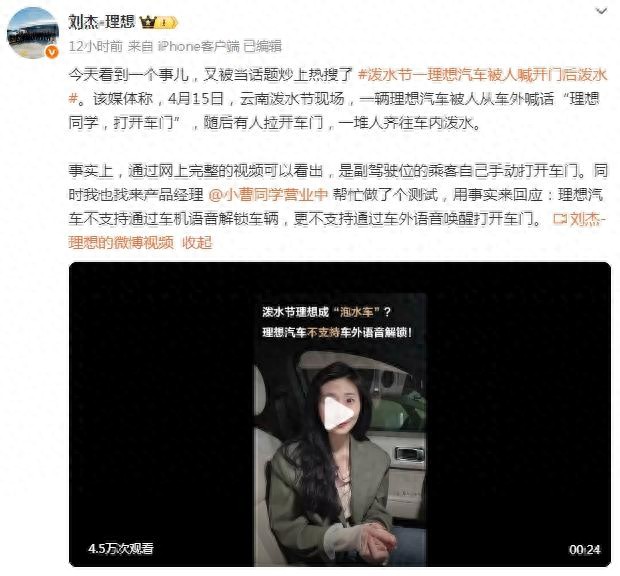 4月17日,理想汽车副总裁刘杰发微博称:今天看到一个事儿,又被当话题炒上热搜了 #泼水节一理想汽车被人喊开门后泼水#。该媒体称,4月15日,云南泼水节现场,一辆理想汽车被人从车外喊话“理想同学,打开车门”,随后有人拉开车门,一堆人齐往车内泼水。