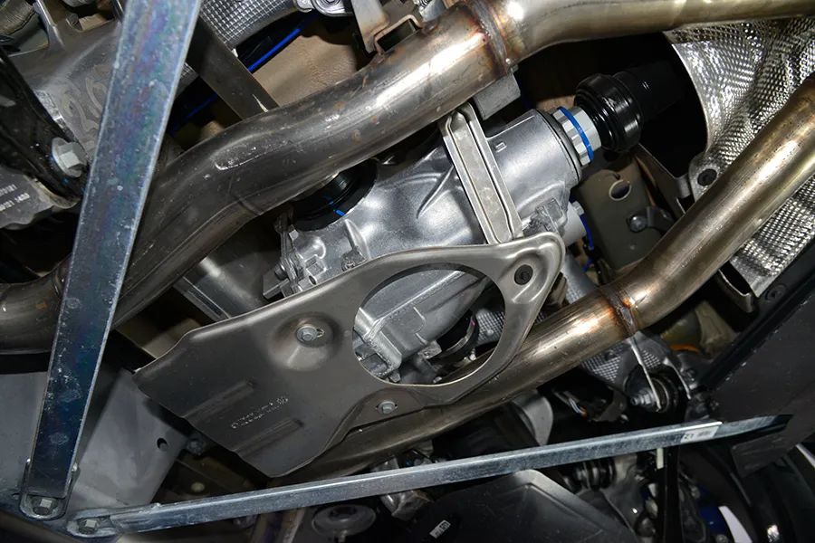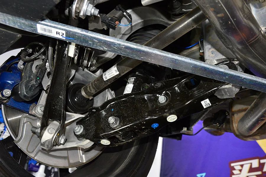 后桥差速器安装在后副车架内,旁边有两根增强车身刚性的拉杆,类似于改装车上的底盘加强件。