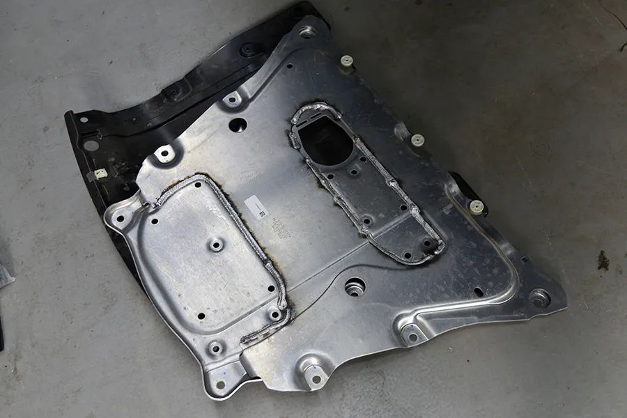 前副车架是全框式结构,双层冲压钢板焊接而成。副车架前端两侧有两块“铝锭”,很明显这是为25%偏置碰撞测试准备的。