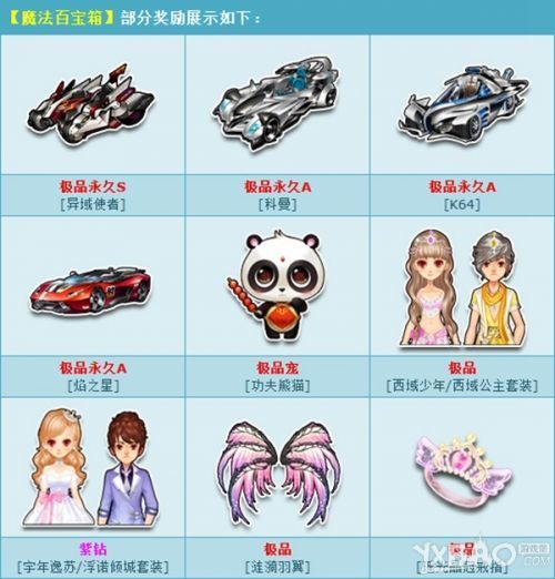 1月8日起,打开魔法百宝箱,就有机会获得永久S车【异域使者】、永久A车【科曼】/【K64】/【焰之星】、人气宠【功夫熊猫】、极品【西域少年/西域公主套装】、紫钻【宇年逸苏/浮诺倾城套装】或其他奖励之一!