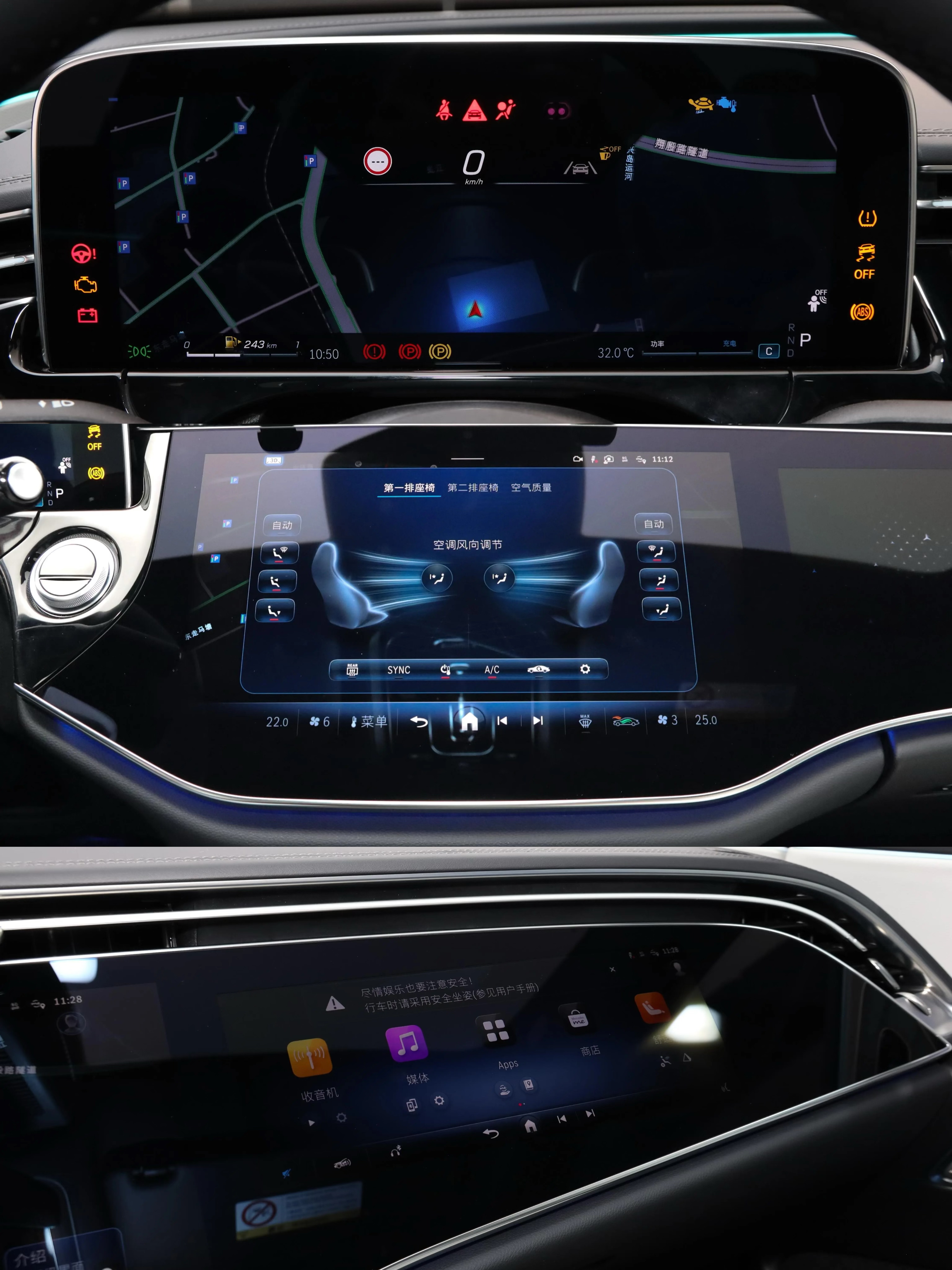 打开车门充满豪华感和科技感,并且加入了不少的运动元素。三幅式多功能方向盘,表面用皮质包裹,增加了握感的细腻性,并配有记忆功能和换挡拨片。14.4英寸的中控屏+12.3英寸的副驾驶副驾驶娱乐屏,配合12.3英寸的悬浮式全液晶仪表,提升了车内的科技气息,内置语音分区域唤醒功能、车联网、手机互联映射、OTA升级、Wi-Fi热点、车载蓝牙/导航等功能,带来了一定的驾驶便利性。触手可及的地方均采用软性皮质材料进行包裹,加上精细的缝线拼接工艺,提升质感的同时,增加了豪华感的档次感。