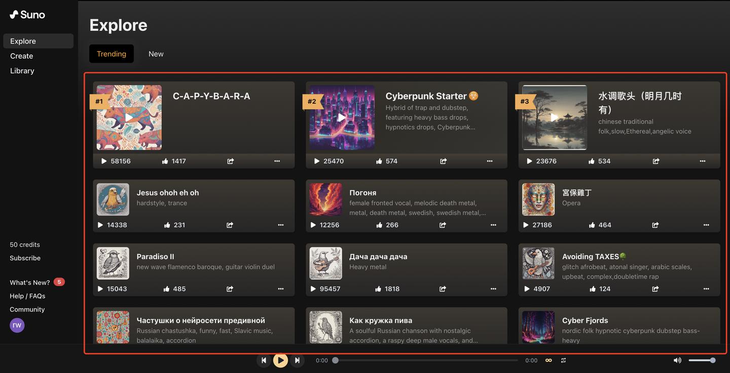 我们看他给出的一个示例:a dark grime song about writing a face-melting guitar solo(一首关于写出令人融化的吉他独奏的黑暗污垢歌曲),其实从这个示例就可以看出我们撰写这个描述的一些要领,要写清楚想要创作的歌曲的风格、主题、氛围等等,基本跟我们使用任何一款AI工具一样,要描述的足够清晰,让它可以明白我们真正的目标是干什么。