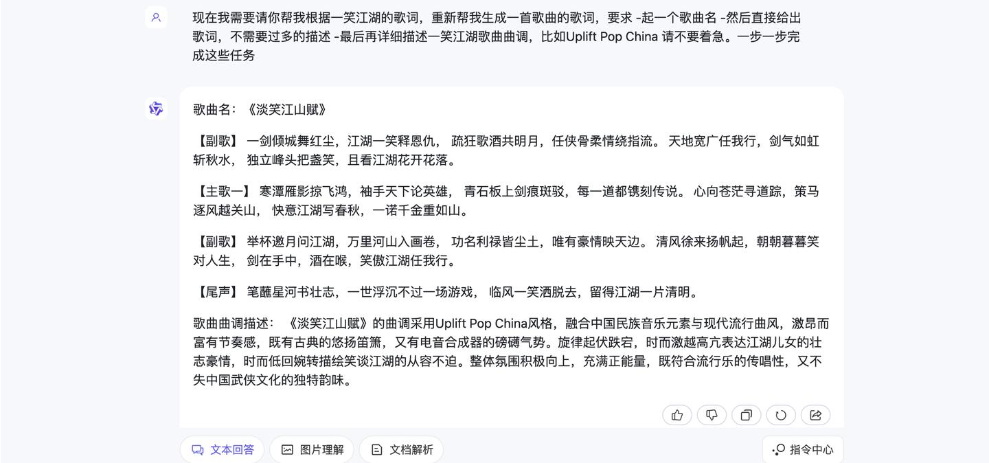创作一首歌曲,对于作者这种乐盲来说,我不知道该该如何写歌曲的描述。我可以使用通义千问来帮助我写出一个歌词和给出曲调风格的描述,再交给Suno来创作歌曲。当然你可以不用通义千问,用GPT、Claude也是一样,用任何一个大语言模型都可以。作者这里选用通义千问的原因是我要创作一个类似现在在网上爆火的一笑江湖的歌曲,通义千问认识这个歌。