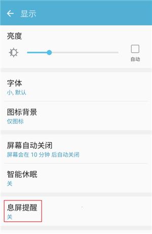 2、在【显示】里,找到【息屏提醒】这项,把它关闭即可。