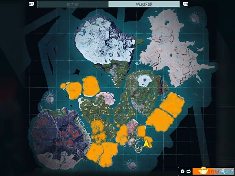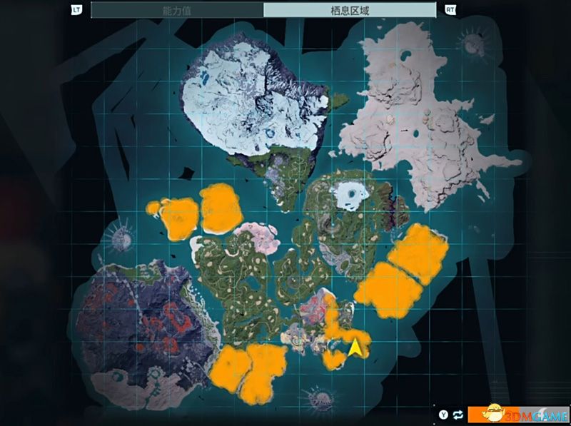 栖息地以橙/蓝色雾状色块显示在地图上。