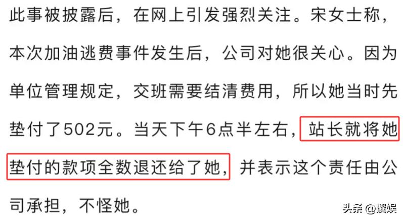这件事发生之后,宋大姐很可能会心情糟糕而影响到工作。好在加油站负责人非常体恤员工,表示这件事不怪宋大姐,而且还把钱都还给了她。
