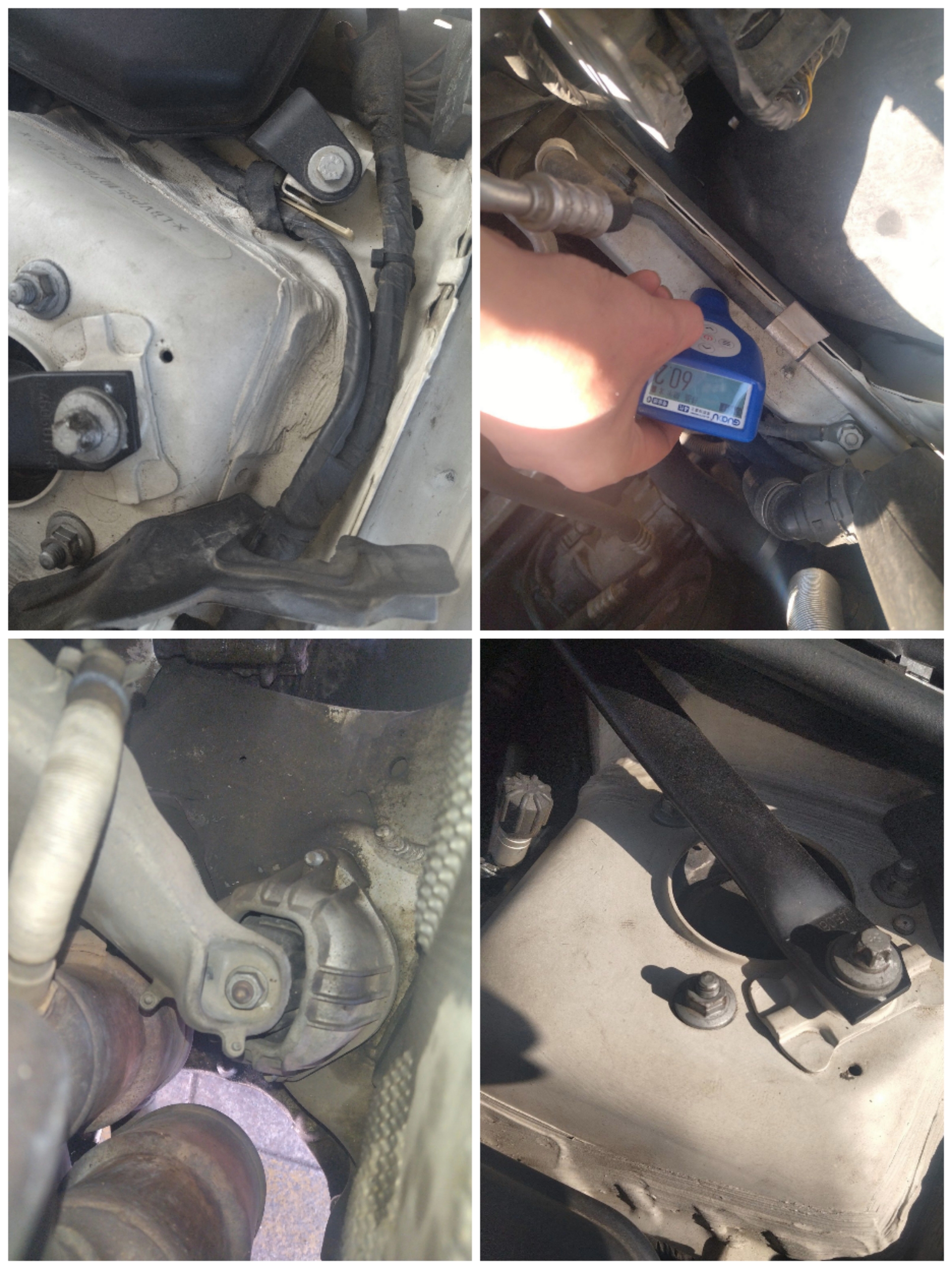 变速箱机脚更换,变速箱油底壳没有打胶,螺丝却是拆过了,综合配件的新旧成色,多半换过了!发动机和变速箱绞合连接位置的螺丝也拆过,综合上部各个附件的情况,大师兄推测发动机吊装维修的几率很高!