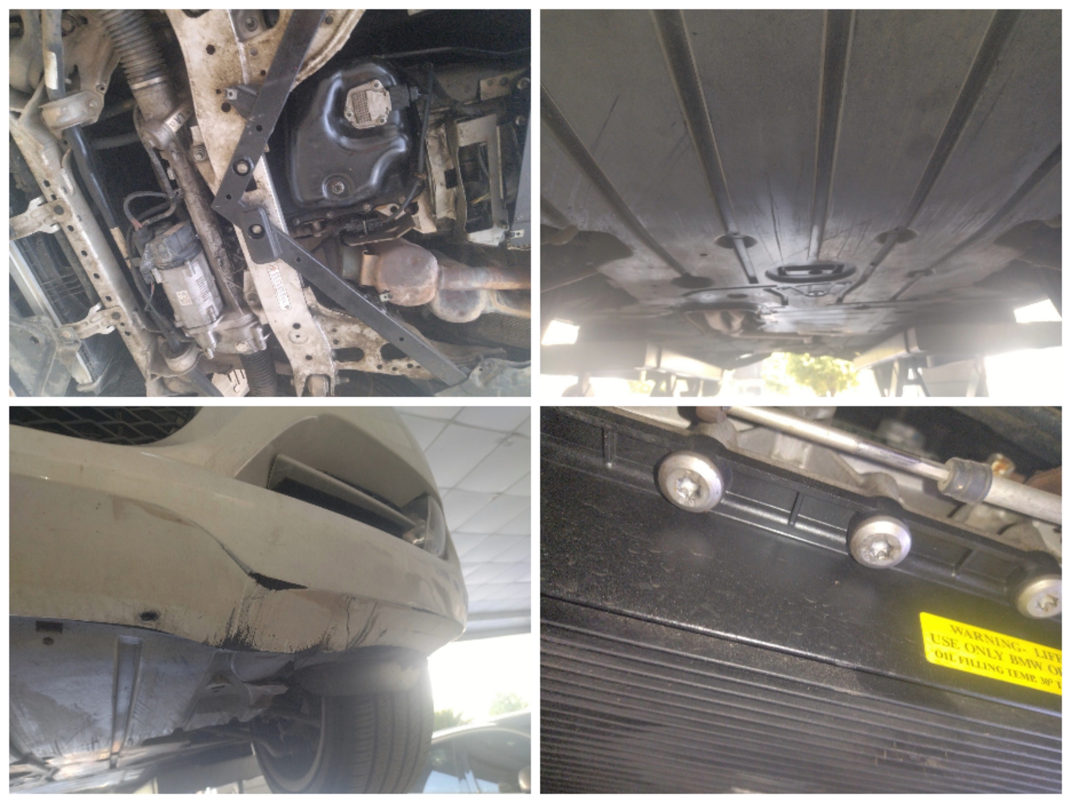 升起底盘,可以看见发动机护板上散落的油迹,底板还轻微托底剐蹭了,问题倒不是很大,不渗油的宝马就不是真宝马!拆掉护板,没有看到明显滴油的地方,发动机油底壳也重新密封打胶了,说明漏油已经处理过了!