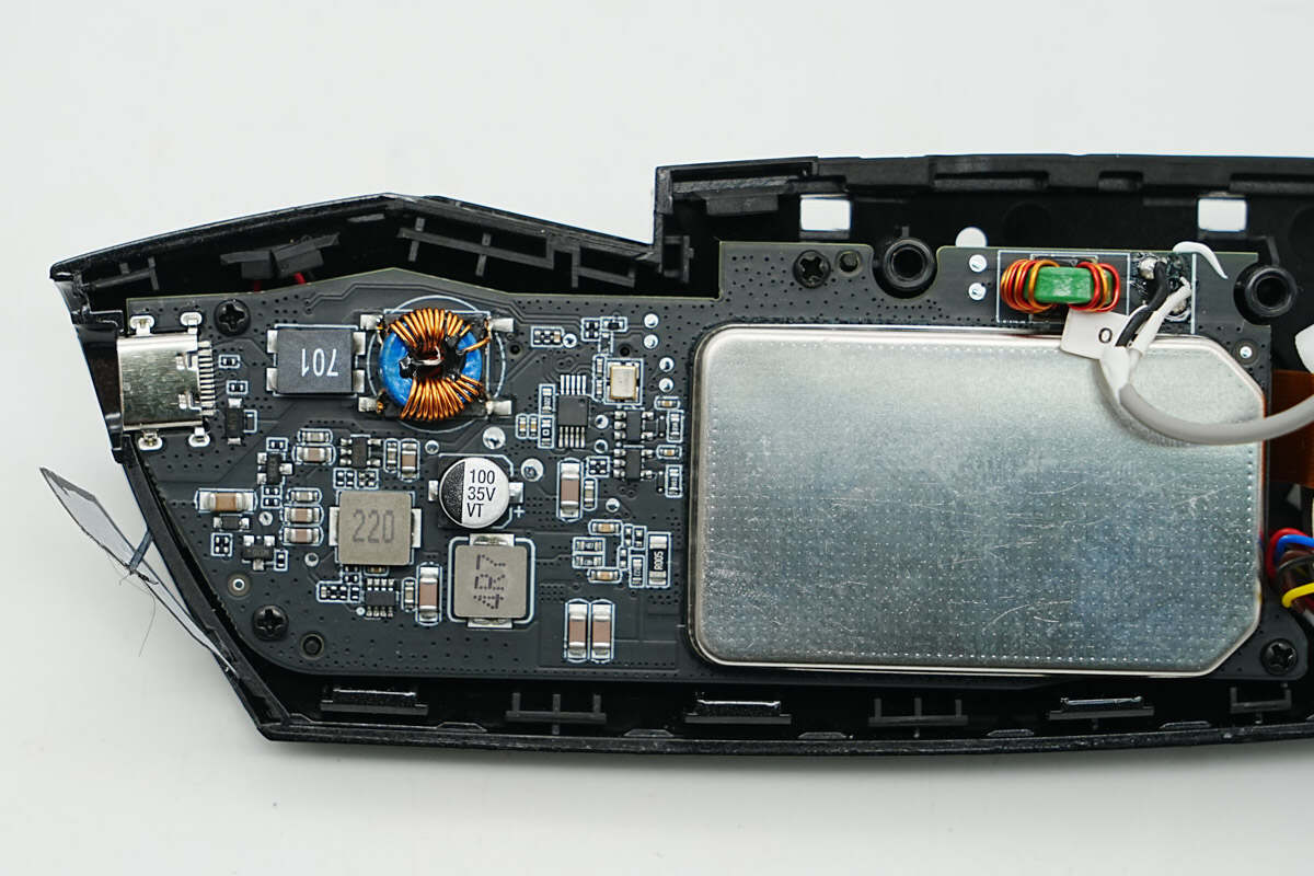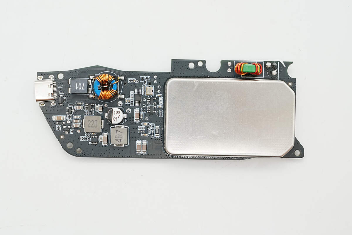 USB-C接口母座所在小板正面一览,设有共模电感、滤波电容等器件,同时右侧区域覆盖屏蔽罩。