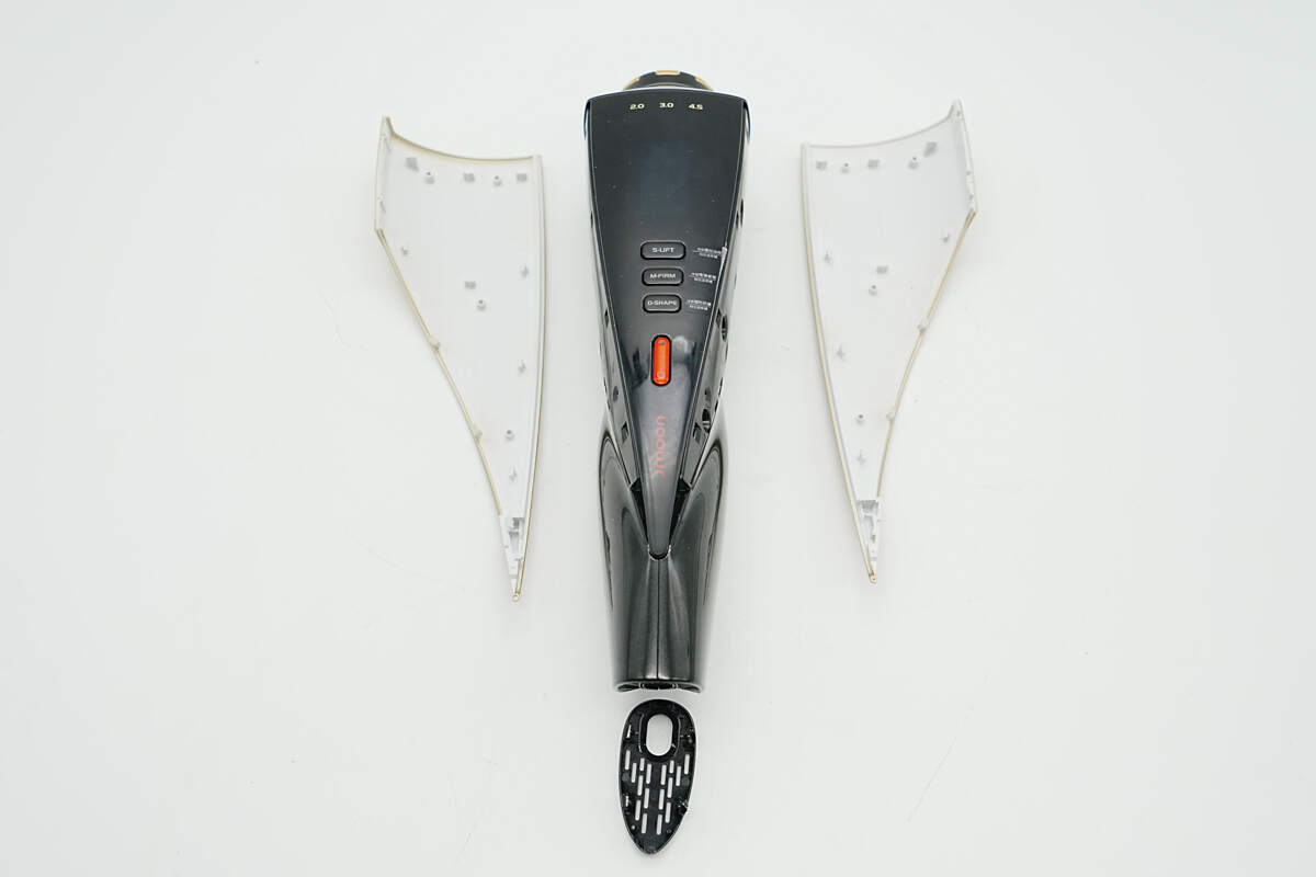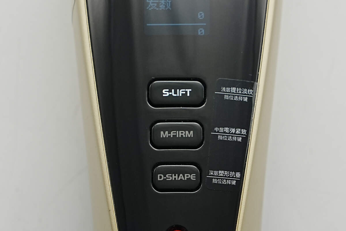 电源键上方是S-LIFT、M-FIRM、D-SHAPE三个工作模式按键,右侧贴有印有相应作用提示的塑料膜。