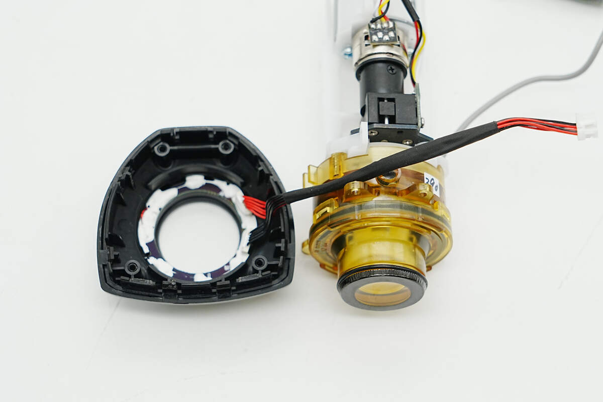 将塑料壳拆下,内部设有一个环形PCB板,并打胶加固,通过导线插拔式连接。