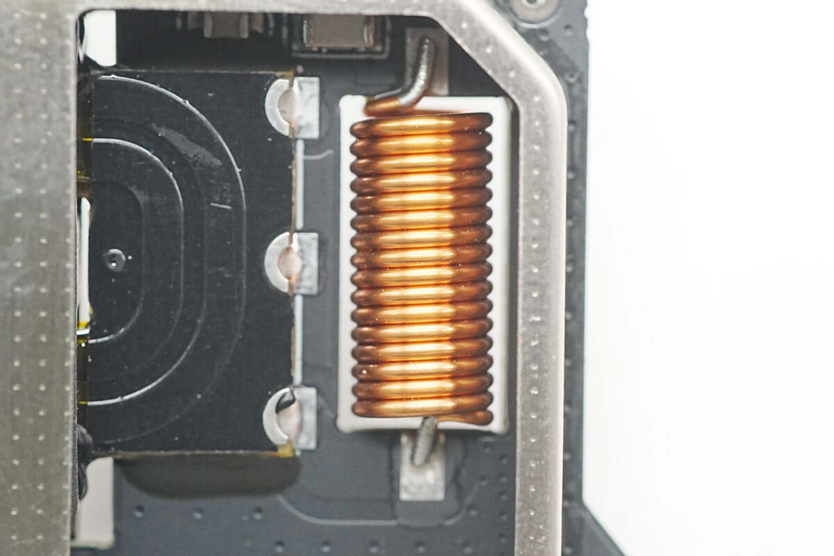 打开屏蔽罩,对应变压器磁芯区域也有金属片遮盖,左侧设有两颗氮矽科技的氮化镓功率器件。