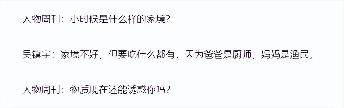 吴镇宇早年受访时曾表示妈妈是一个渔民,并透露妈妈并不是很想让自己当演员,害怕报纸上出现什么新闻,以至于当有人问她是否住儿子家时,吴妈妈都否认掉了。