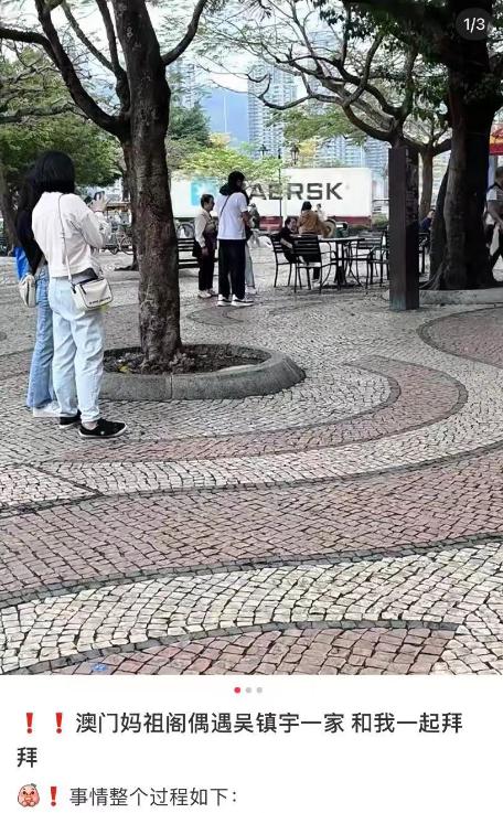 偶遇者所发原文被扒出,据其分享,她是在4月4日游澳门妈祖阁时偶遇到的吴镇宇一家,虽然吴镇宇当时就在自己身边,但由于戴了口罩该网友并没有认出来,直到看到胖胖的费曼才敢确定。看来费曼不仅热度比爸爸高,就连辨识度也比爸爸高了呢!