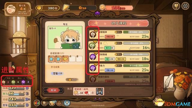 因为在属性达标前,每次学习的进度都会同比下降,因此建议在回合开始时先确认想要学习的项目,之后在回合内有针对性地提高属性。