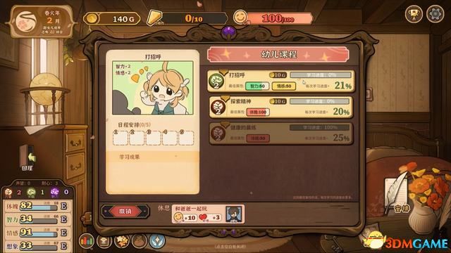 以此计算,心情值的增减依次为“-20→+10→-20”,只要回合结束时心情不低于70,都能保证学习效率。