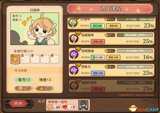 每回合的安排为5次,每学习一次需要消耗10点心情。
