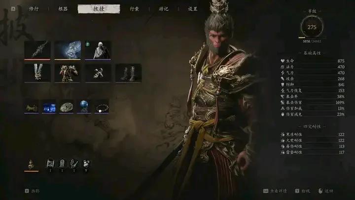 再要吐槽的是数值问题,我是为了四周目开大圣形态去肝的,但是三周目开始难度就上来了,神珍大圣套比凡品大圣套配铁棍的面板差的有点太多了。据说四周目数值更膨胀,那么这个彩蛋就尤其鸡肋了——数值不够打的累,你是大圣形态可是一刀被boss秒了有什么好说的?而且凡品大圣套居然不能触发大圣形态,但凡它能触发大圣形态满足我这类玩家游玩体验我都认了,但它就是纯纯数值,唯一联动就是和牛魔王武器加攻击力。