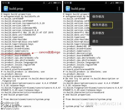 3、找到“ro.product.device=cancro”这一行,把里面的cancro改为virgo,保存并退出。