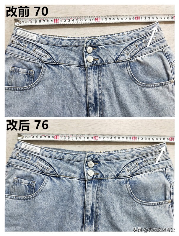 而如果我们在改大过程中十分在意改后的美观度,做到痕迹不明显的话,选择在腰头上拼加的布料是关键。特别是夏季牛仔裤在没有外套来盖裤子腰头时,为了做到改大后的裤子尽量无痕,我都是建议大家使用同色布料去拼在腰头上。