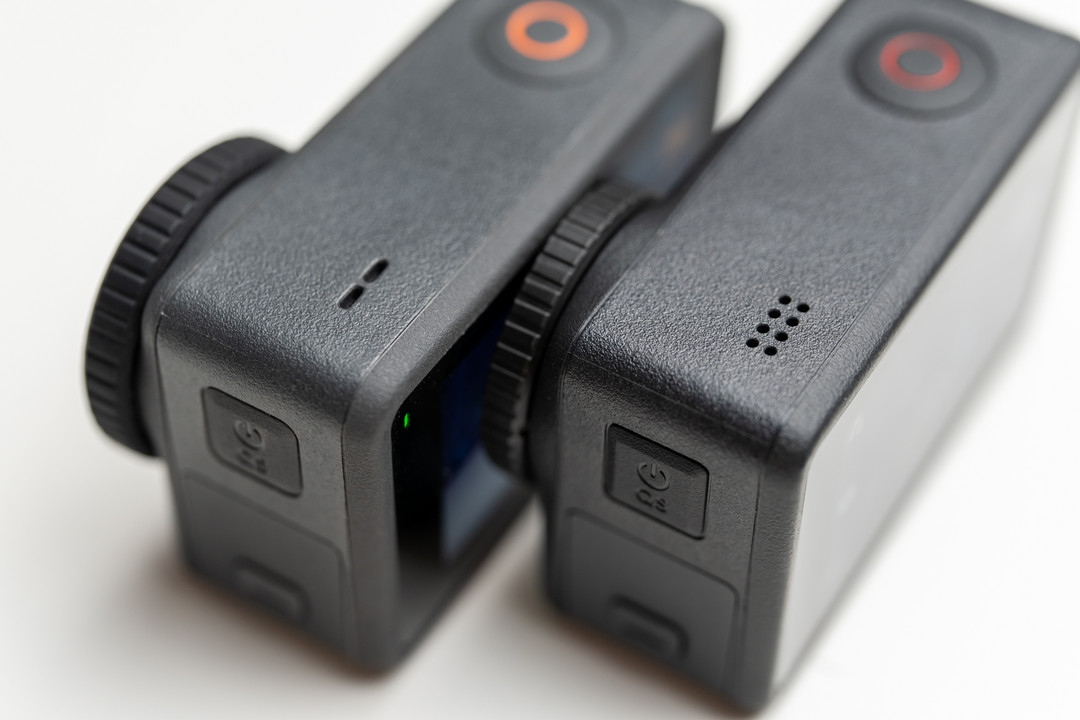 正面的Acion 4 LOGO名牌依然保持了和上一代同样的设计,将色温传感器放到了字母“O”中。并且这一代的色温传感器实际拍摄中,对色温的还原相比上一代也有所提升,后面代详细对比我们会提到。