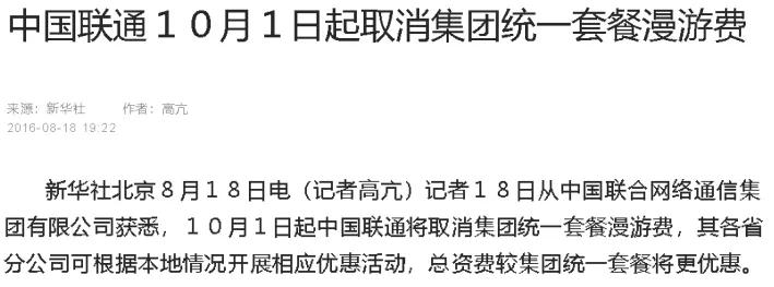船长查了查新闻,中国联通在2016年10月1日起,取消了集团统一套餐漫游费。针对已经属于长市漫一体化套餐用户,其套餐在中国大陆范围内拨打、接听电话的资费是一样;而针对仍需收取漫游费用的套餐用户,其套餐的资费暂不会进行变更,如有需要建议可将套餐变更为没有国内长途、国内漫游费的套餐。