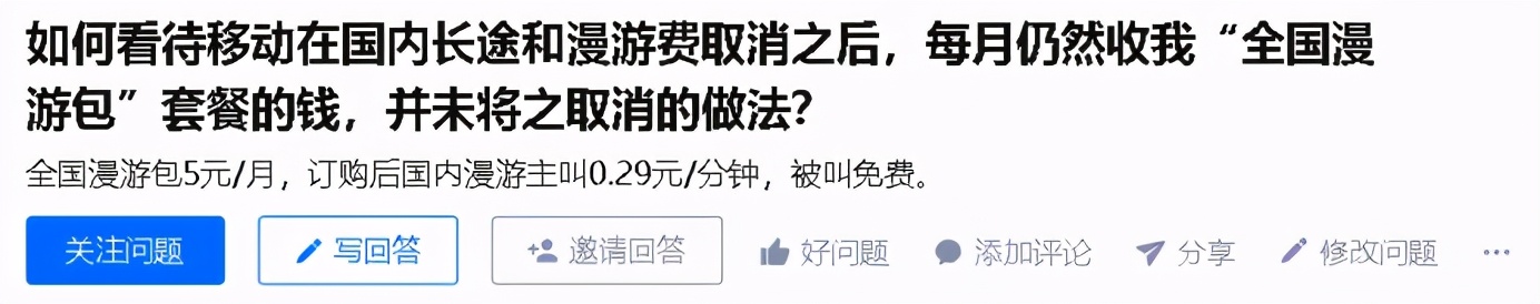 按说,自2017年9月1日起,中国电信、中国移动、中国联通三大运营商全面取消手机国内长途和漫游费(不含港澳台),比原计划提前了1个月。但实际上,即便在2018年,某知名问答论坛上,还有网友反映“漫游包套餐”的费用仍在收取: