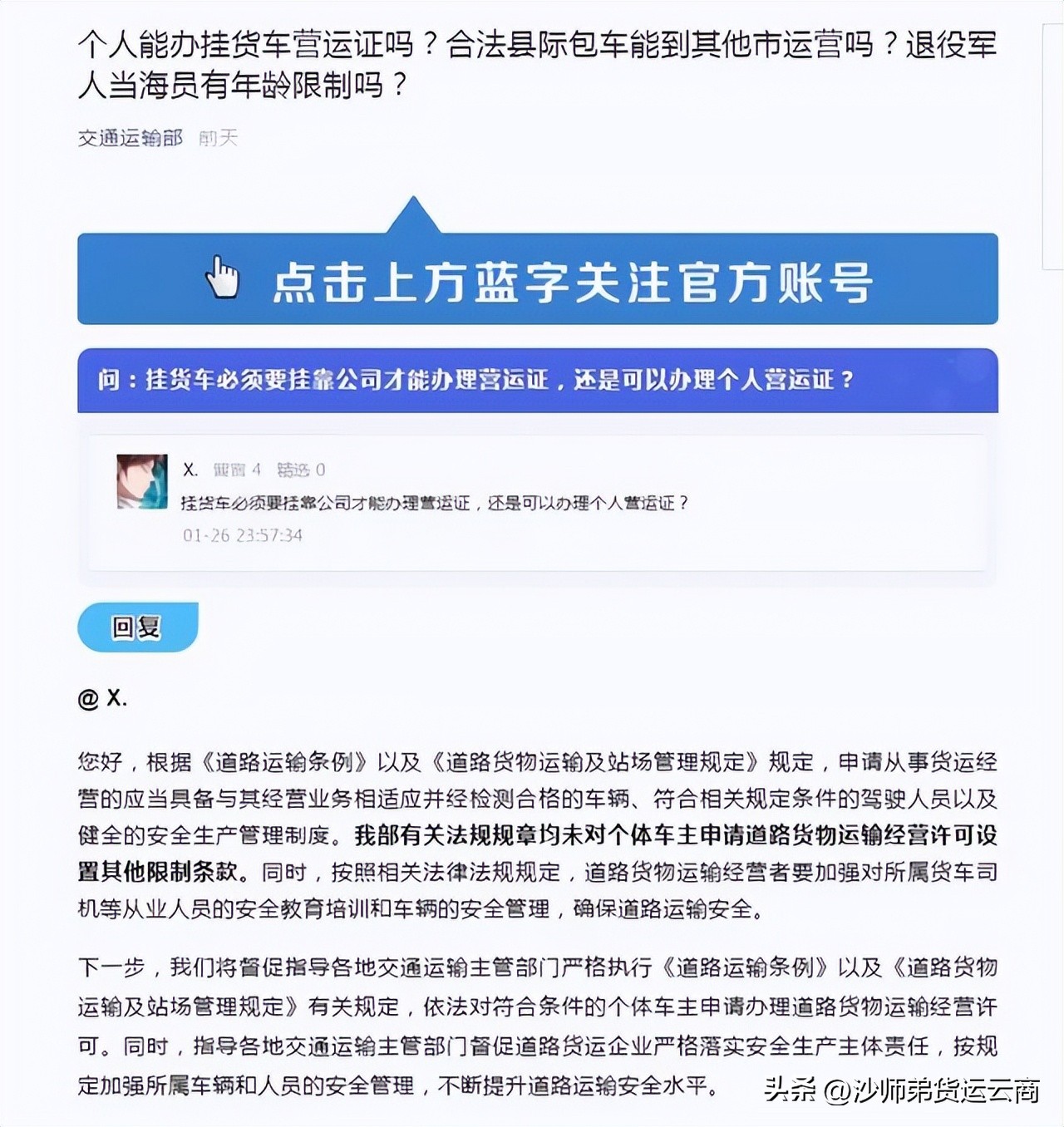 有位卡友曾向交通部提问:挂货车必须要挂靠公司才能办理营运证,还是办理挂货车个人营运证?
