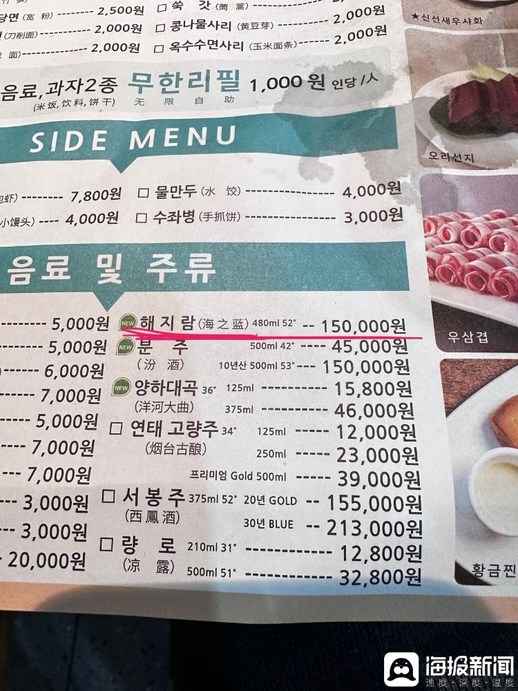 韩国一家饭店里,售卖480ml 52°的海之蓝,卖15万韩元。受访者程女士供图
