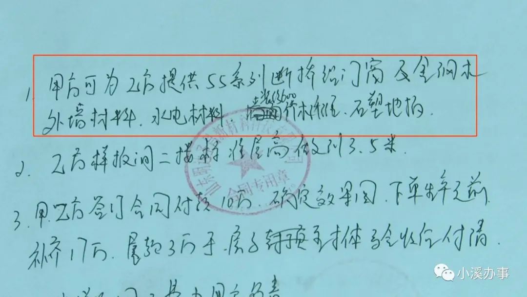 不过有了上次的教训,王先生让销售经理在合同最后一页,手写补充了一些内容,包括甲方需要提供的装修材料,房子层高、面积、造价以及造价中不包含什么材料等等。